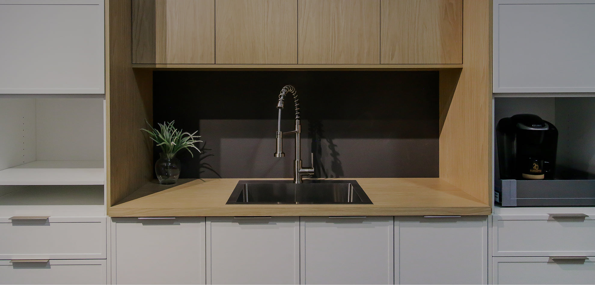 Avec les caissons préassemblés en usine de Kwizine en stock, adoptez facilement une cuisine au design minimaliste et fonctionnel.